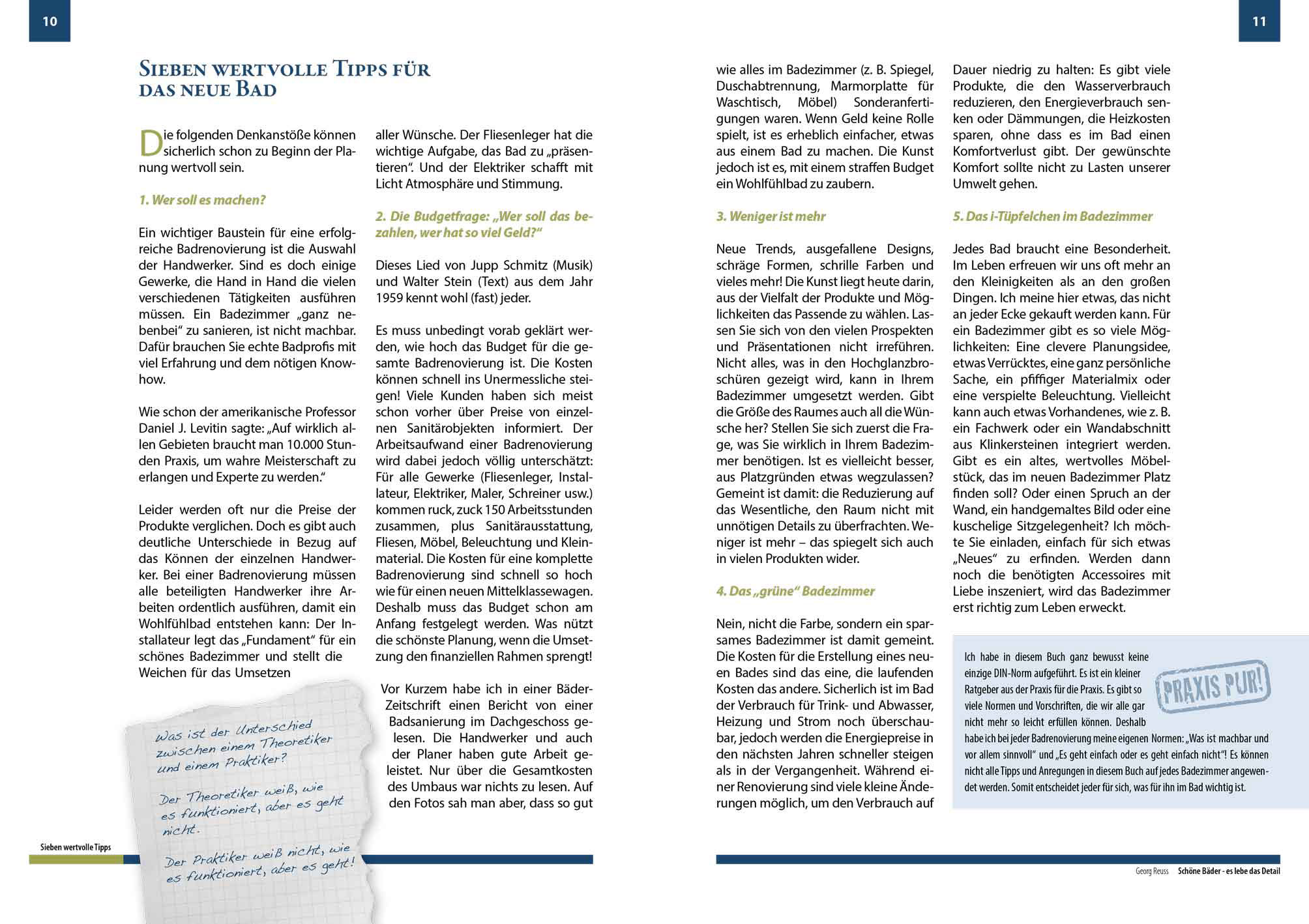 Das heimische Badezimmer wird für alle immer wichtiger. Viele sind der Meinung, die Schönheit eines Bades entscheidet sich alleine am Preis der einzelnen Produkte. Dieses Buch will zeigen, dass es gerade die Details sind, die ein schönes Bad ausmachen. Viele davon verlangen nur eine gute Planung und genaue Ausführung und kosten keinen Euro mehr. Die Kunst besteht darin, mit einem straffen Budget ein Wohlfühlbad zu realisieren. In diesem Buch finden Sie hierzu viele Tipps und Anregungen – aus der Praxis für die Praxis.